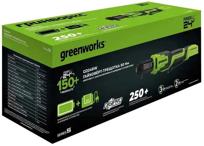 | Комплект поставки | Гайковерт-трещотка Greenworks GD24RW,1 хАКБ 2Ач,1 х Зарядное устройство,Руководство по эксплуатации,Гарантийный талон,Прочная сумка для переноски/перевозки. |