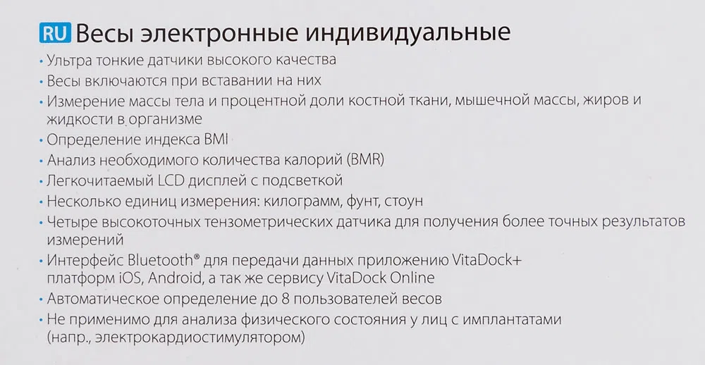 | Особенности | Передача данных в сервис VitaDock Online через приложение VitaDock для мобильных устройств с платформами iOS и Android. |