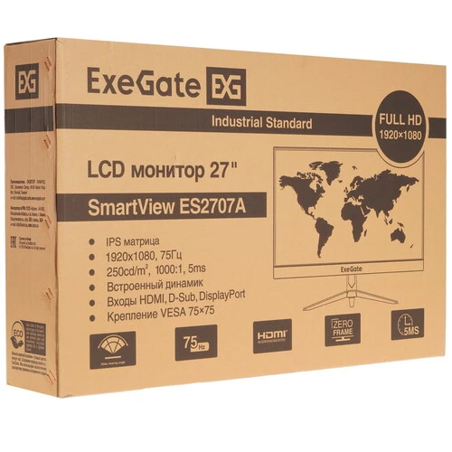 Монитор ExeGate 27" SmartView ES2707A черный IPS LED 5ms 16:9 HDMI M/M матовая 250cd 178гр/178гр 1920x1080 75Hz DP VGA FHD 3.4кг