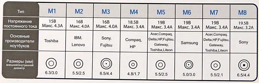| Штекер 8 | диаметр: 6.5/4.4 мм, 19.5v, 3.2A |